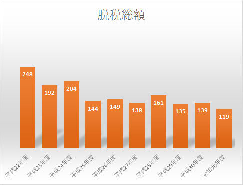 脱税総額(告発分)は、119憶円で、過去10年間で最低となっており、10年前(平成22年度)の248億円と比べ、半減し、減少傾向にあり、脱税額の小口化が進んでいます。