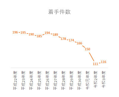 着手件数は、116件で、前年対比プラス5件(4.5%増)となっており、コロナの影響を強く受けた昨年度のマイナス39件(26%減)と比べ、増加に転じています。主な要因として考えられるのは、新型コロナウィルス感染症の対応により、新規の着手件数が激減した昨年度と比べ、感染対策の浸透などにより調査環境が整ってきており、増加に転じているものと推測され、今後、着手件数もコロナ前の水準(年間170件前後)に戻っていくのではないかと思われます。