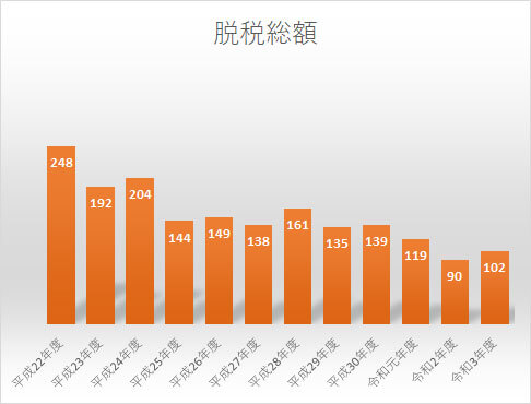 脱税額(告発分)は、60憶円と、過去10年間で最低となっており、10年前(平成24年度)の174億円と比べ、半分以下と減少傾向にあり、脱税の小口化が進んでいると言えます。