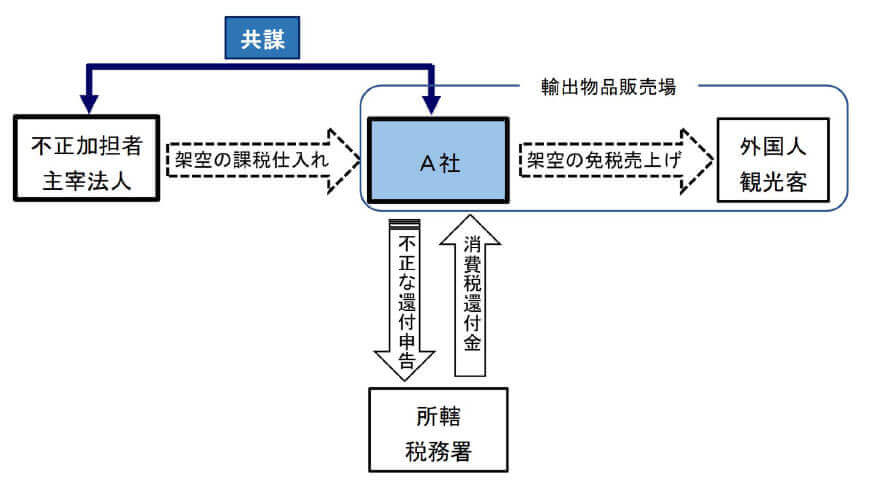 A社は、日用品の輸出販売のほか、輸出物品販売場の経営等を行うものですが、取引事実がないにもかかわらず、不正加担者と共謀して、同人が主宰する法人から化粧品等を仕入れたかのように装い架空の課税仕入れを計上し、当該化粧品等を輸出物品販売場において外国人観光客に販売したかのように装い架空の免税売上げを計上する方法で、不正に消費税等の還付を受け、又は受けようとしました。