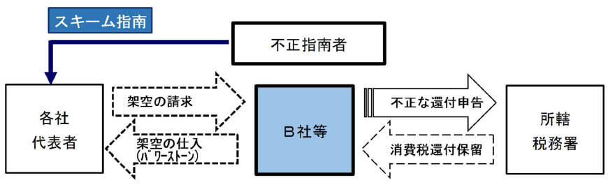 B社等数社は、不正指南者から指示されたとおり、B社等各社の代表者からパワーストーンを仕入れたかのように仮装し架空の課税仕入れを計上するスキームを利用して、不正に消費税等の還付を受けようとしたとして、B社等数社及び代表者のほか、不正受還付スキームを考案した指南者を告発しました。