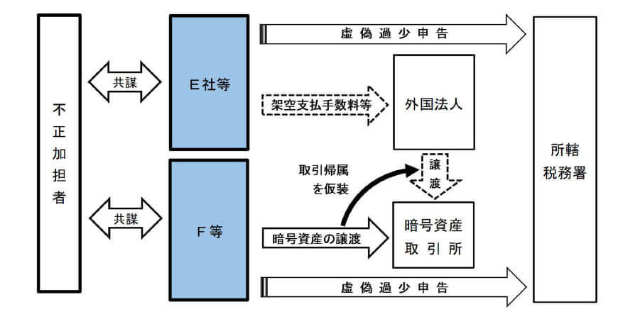 E社及びF等は不正加担者と共謀し、同人が日本における代表者を務める外国法人に架空の支払手数料等を計上する、あるいは暗号資産を取引所で譲渡した取引の主体を外国法人に仮装する方法などで、法人税又は所得税を免れていたとして、各納税義務者のほか、不正加担者についても併せて告発しました。