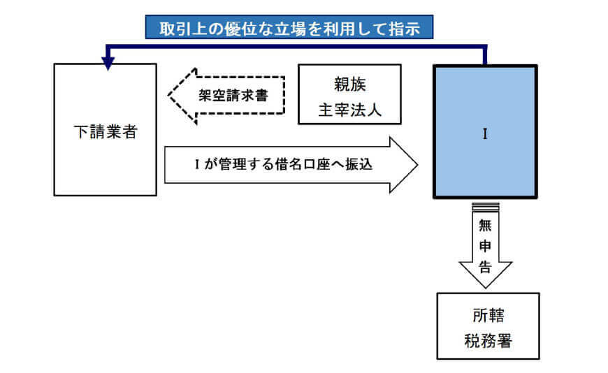 Iは、大手繊維会社の従業員という立場を利用し、下請業者から資金提供を受けていましたが、親族が主宰する法人名で架空の請求書を作成し、当該請求書に基づき、下請事業者から自身が管理する借名預金口座に資金を振り込ませるなどの方法により所得を隠匿した上で、所得税の確定申告書を申告期限までに提出せずに多額の所得税を免れていました。