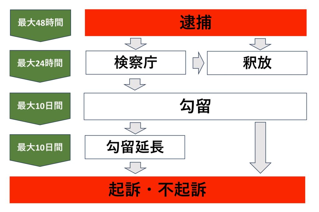 威力業務妨害罪で逮捕された場合、以下のような流れで刑事手続きが進められていきます。