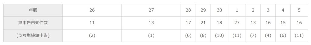 報道では、事件の詳細は明らかにされていませんが、本件事案は、個人事業主による無申告事案で、国税庁が平成29年度(2017年)頃から重点事案として積極的に取り組んでいる無申告事案の一つである(背景として平成23年度税制改正による単純無申告逋脱罪の創設がある)。国税庁が毎年6月に公表している「査察の概要」(いわゆる「脱税白書」)によると、無申告逋脱事案の告発件数は次の通りに推移しており、増加傾向にあることが伺える。