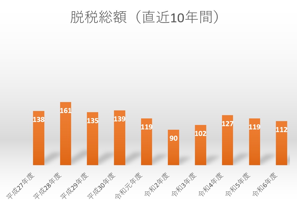 脱税総額は、112憶円と、過去10年間の平均額(124億円)を下回るもののほぼ同水準となっていますが、10年前(平成27年度)の138億円と比べ、26億円近く減少しており、依然として脱税の小口化が続いていると言えます。