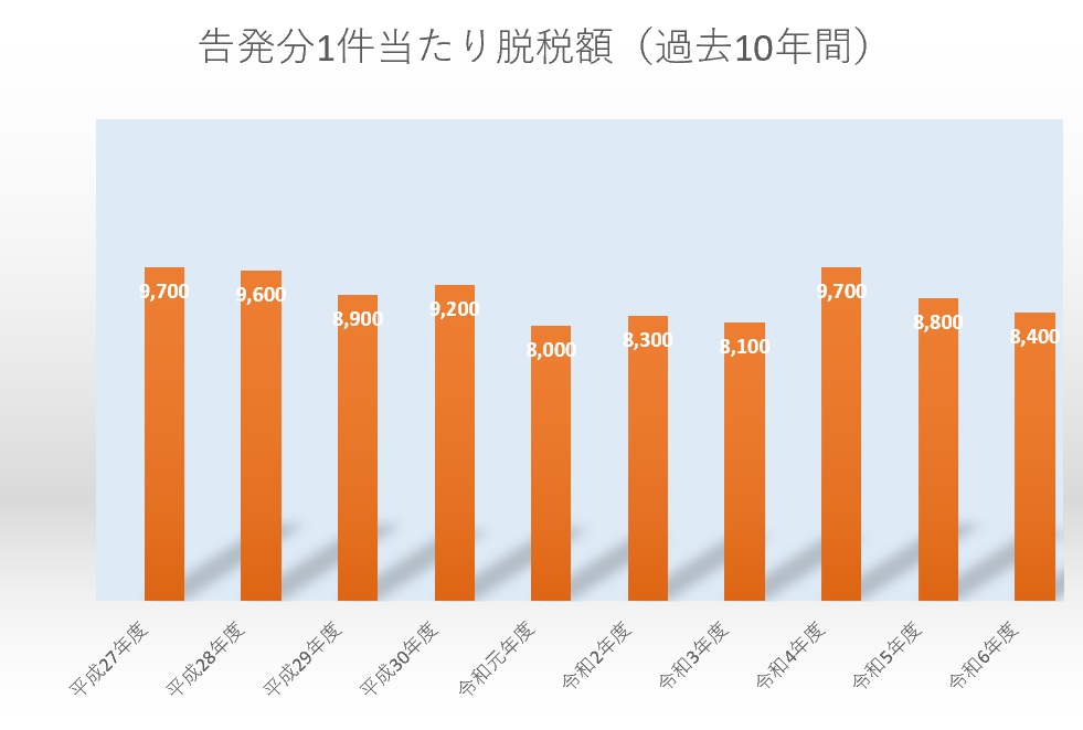 1件当りの脱税額(告発分)は、平均8,400万円と、昨年分の8,800万円より減少していますが、15年前(平成22年度)の1億3,700万円と比べ、5,000万円以上、減少しています。査察調査の対象は、脱税額1億円が目安とされていますが、最近では脱税の小口化が進んでおり、任意調査レベルの数千万円の脱税でさえも、査察調査の対象となり告発される可能性があることから、引き続き、注意する必要があると言えます。